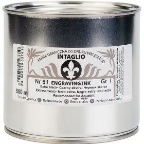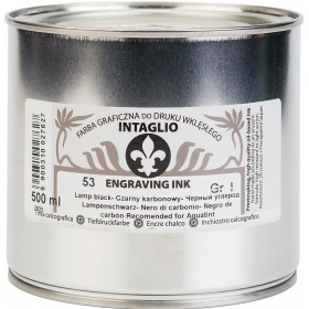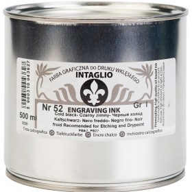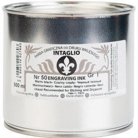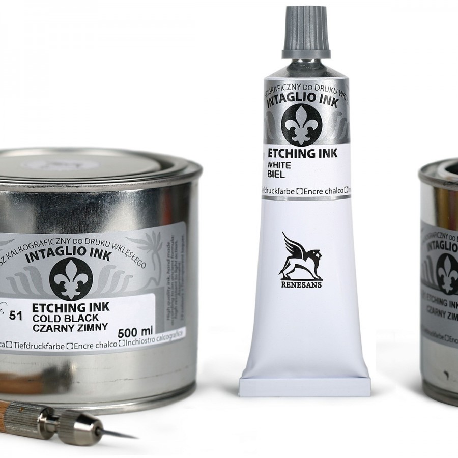 Renesans Graphic Oil Paints, 60 ml and 500 ml. Available in 17 basic colors + Transparent Medium, divided into three price ranges, in metal tubes. Black inks (cool and warm tones) are also available in 500 ml cans. Auxiliary products for graphic arts: transparent mediums for paints, spirit-based varnish, black varnish, chalcographic oils, waxes, powdered bitumen, resins, and others.
