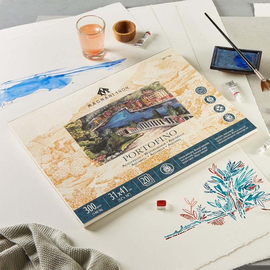 <p>'PORTOFINO' WATERCOLOR PAPER - 100% COTTON - 300 gsm and 640 gsm - Hot Press - Magnani 1404 - a smooth, almost satin-like, premium watercolor paper produced using traditional methods on cylindrical drum machines. This is one of the watercolor papers with the longest history of production, enjoying an impeccable reputation among watercolorists. It is a 100% cotton, acid-free paper, made from the purest cotton fibers. It is double-sized internally and externally using a synthetic gelatin substitute, without the use of animal-derived substances. Its acid-free nature guarantees resistance to aging. Thanks to its strong sizing and the use of cotton in its natural form, it withstands corrections and the removal of paint from its surface exceptionally well, while also being able to absorb large amounts of water without warping. Recommended for painting with watercolors, tempera, gouache, ink, or acrylics. Recommended for printmaking techniques such as lithography or linocut, as it can be soaked, and its smooth surface ensures high-quality prints.</p> -