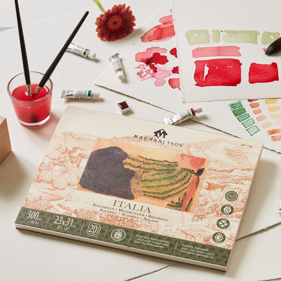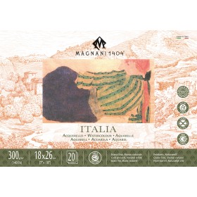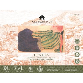 'ITALIA' WATERCOLOR PAPER - 100% COTTON - 300 gsm and 640 gsm - Cold Press - Magnani 1404 - is a prestigious watercolor paper produced using traditional methods on cylindrical drum machines. It is one of the watercolor papers with the longest production history, enjoying an impeccable reputation among watercolorists. It is a 100% cotton, acid-free paper, made from the purest cotton flowers. It is double-sided, internally and externally sized, using a synthetic gelatin substitute, without the use of animal-derived substances. Its acid-free nature guarantees resistance to aging. Thanks to its strong sizing and the use of cotton in its natural form, it withstands corrections and the removal of paint from its surface exceptionally well, while also being able to absorb large amounts of water without warping. Recommended for painting with watercolors, tempera, gouache, ink, or acrylics.