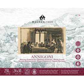ANNIGONI SERIES DRAWING PAPER, developed in collaboration with master artist Pietro Annigoni - 'ANNIGONI' - 100% COTTON - 250 gsm - Natural Rough - Smooth - Magnani 1404 - paper produced using traditional methods on cylindrical drum machines according to special recipes. The paper contains 100% cotton, as well as an addition of colored cellulose fibers, which are faintly visible in the beige mass. It is made from the purest cotton flowers without the use of acids or chlorine derivatives. Its natural surface and color make it excellent for drawing with charcoal, sanguine, or pastels. Its acid-free composition and chlorine-free production make it UV-resistant, prevent yellowing over time, and ensure the longevity of the artwork. Its wonderful, pen-like texture captures the intensity of lines and colors and is suitable for use with natural media such as rabbit skin glue.