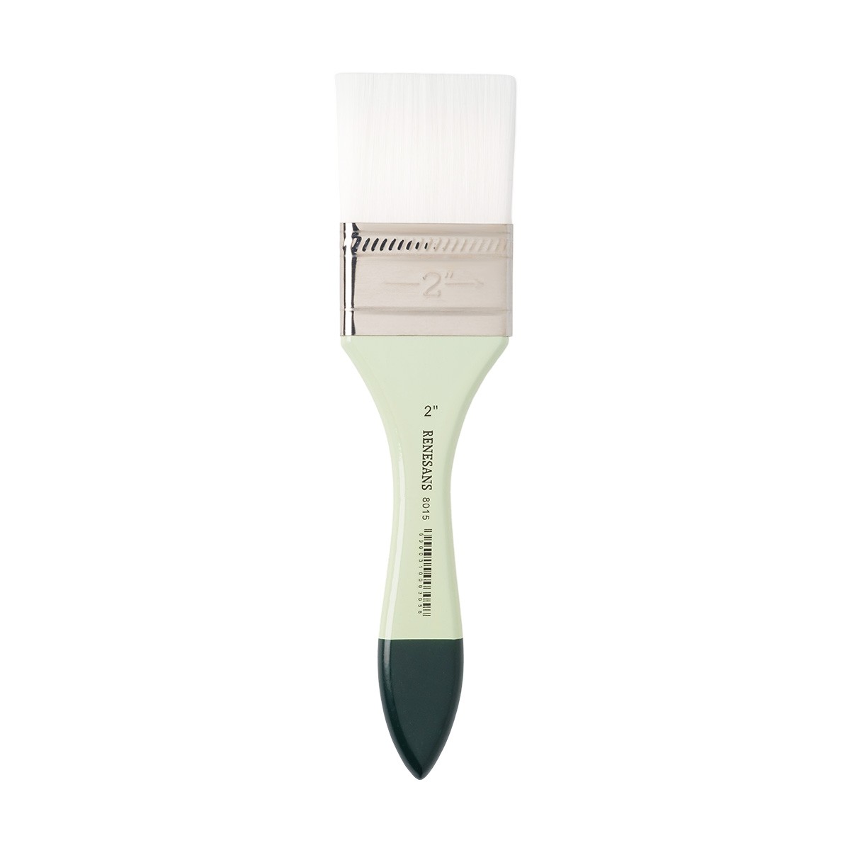 Wide background brush, white synthetic bristles, metal ferrule, short wooden handle (greenish)
