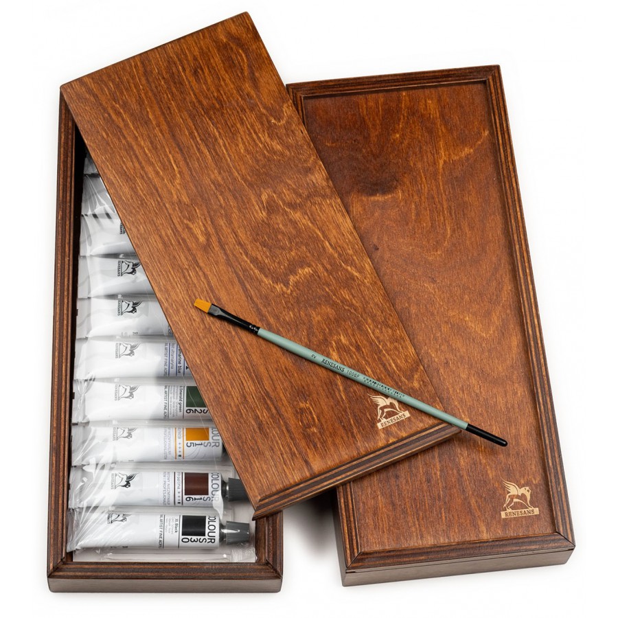 Renesans "Colours" acrylic paint set, wooden paintbox, 10 colors (20 ml tubes), small brush.