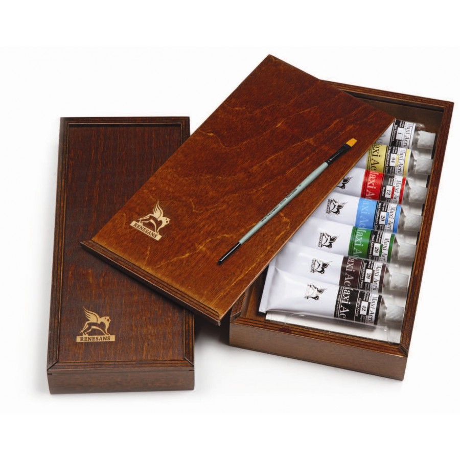 Renesans "MAXI AKRYL" acrylic paint set, wooden paintbox, 7 colors (60 ml tubes), and a small brush.