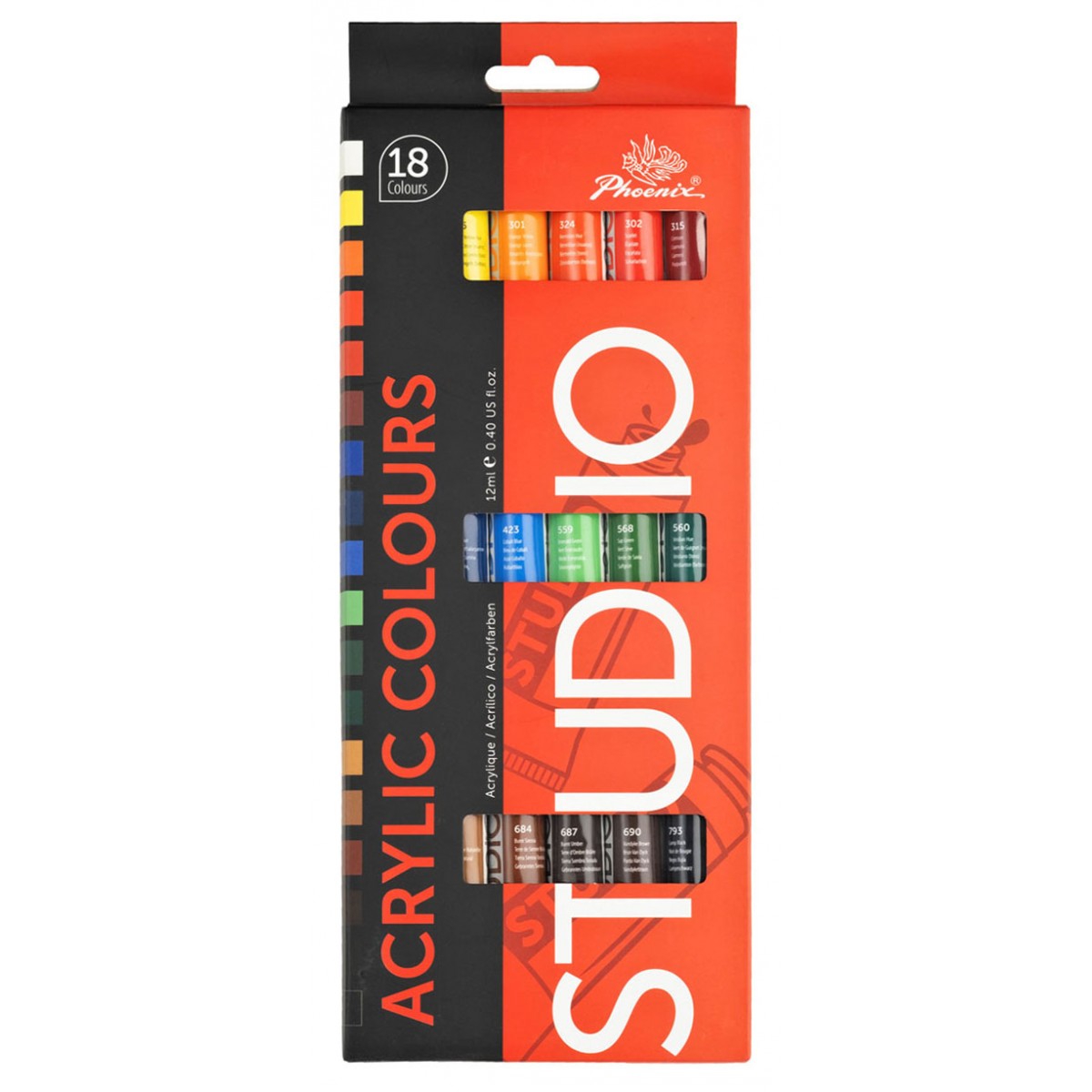 Artist-grade acrylic paints from the American company Phoenix, manufactured in China.