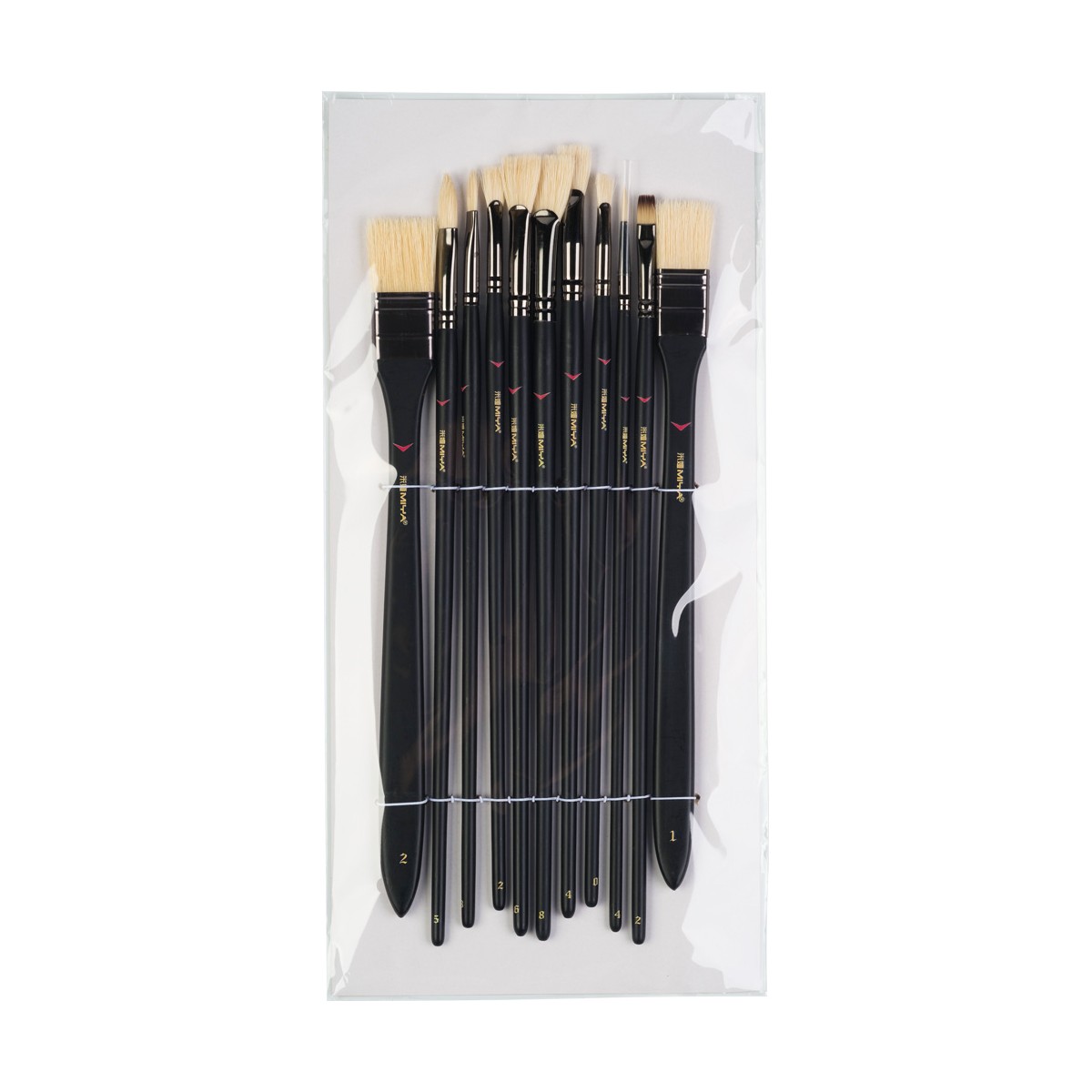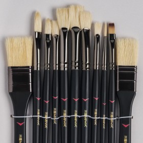 Blister pack of 11, assorted synthetic brushes (2 flat, 4 round) and bristle brushes (flat sizes: 0, 2, 4, 6, and 8—1 of each; cat’s tongue: 3.5; for backgrounds: 1.2)