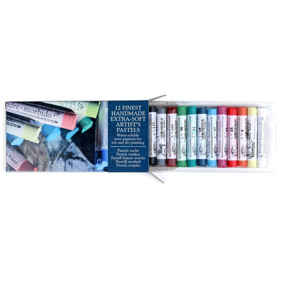 A set of 12 assorted dry pastels in a cardboard slipcase.