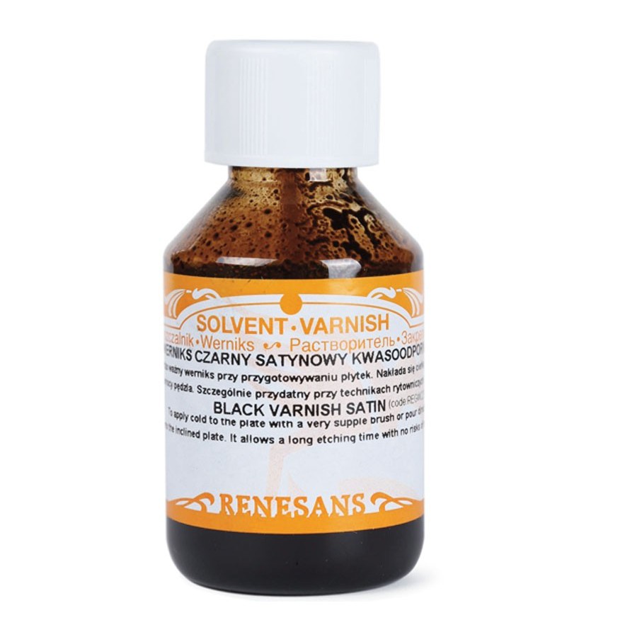 Acid-resistant black satin varnish. An essential varnish for preparing plates. Apply a thin layer with a brush. Particularly useful for engraving and etching techniques. Available in 100 ml bottles.