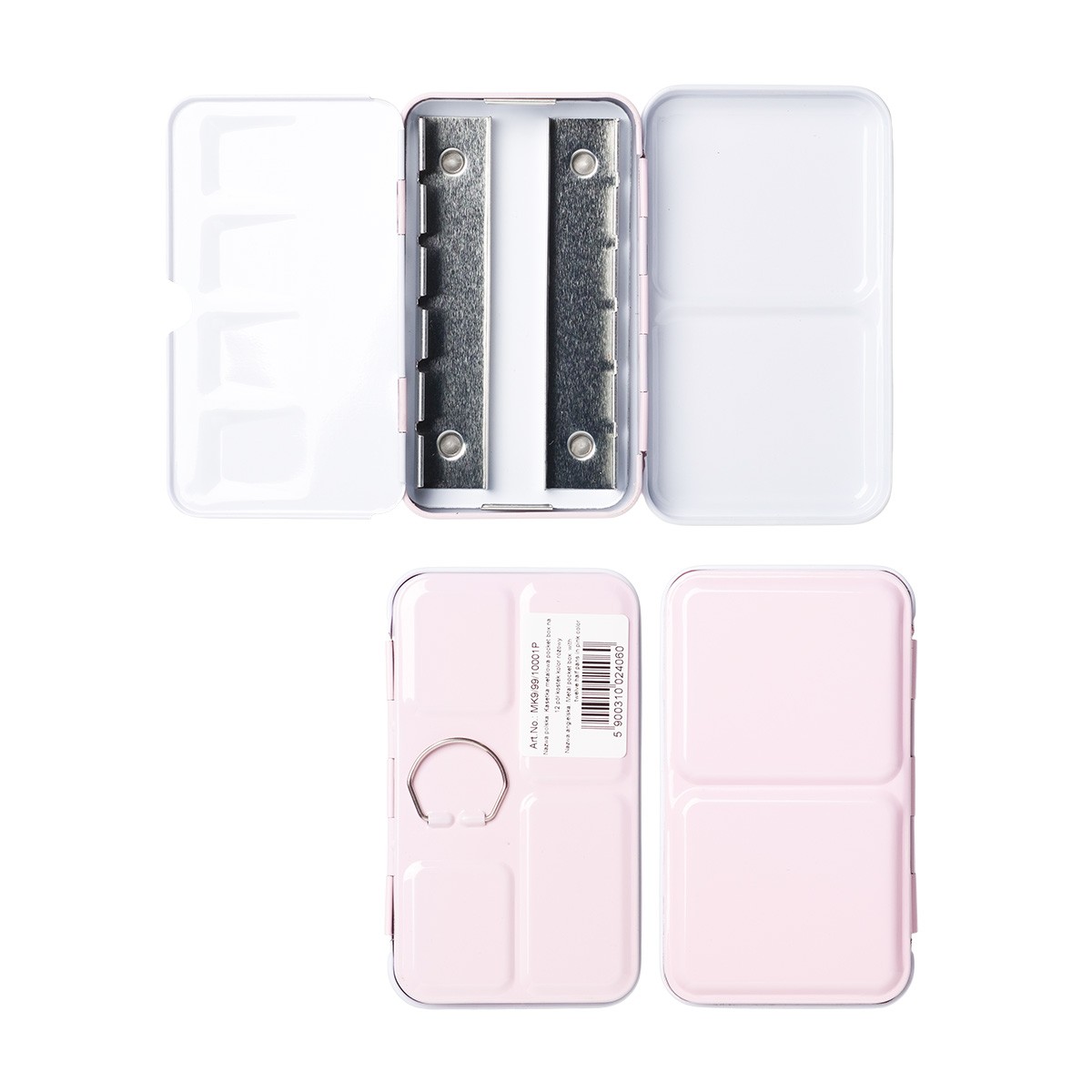 Professional metal "pocket box" case for 12 dice. Pink on the outside, white on the inside
