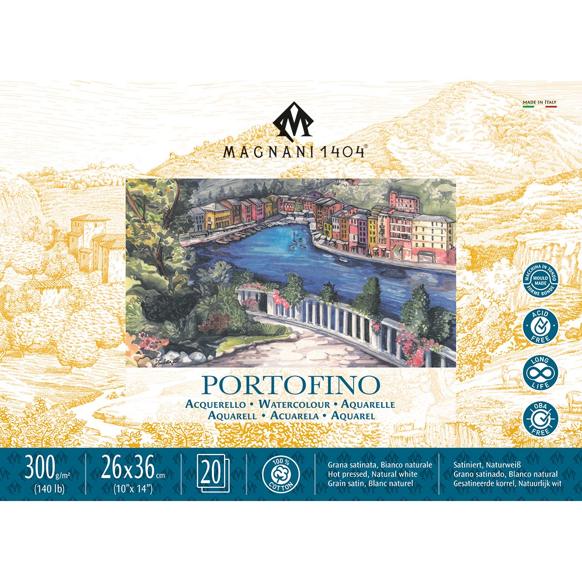 'PORTOFINO' WATERCOLOR PAPER - 100% COTTON - 300 gsm and 640 gsm - Hot Press - Magnani 1404 - a smooth, almost satin-like, premium watercolor paper produced using traditional methods on cylindrical drum machines. This is one of the watercolor papers with the longest history of production, enjoying an impeccable reputation among watercolorists. It is a 100% cotton, acid-free paper, made from the purest cotton fibers. It is double-sized internally and externally using a synthetic gelatin substitute, without the use of animal-derived substances. Its acid-free nature guarantees resistance to aging. Thanks to its strong sizing and the use of cotton in its natural form, it withstands corrections and the removal of paint from its surface exceptionally well, while also being able to absorb large amounts of water without warping. Recommended for painting with watercolors, tempera, gouache, ink, or acrylics. Recommended for printmaking techniques such as lithography or linocut, as it can be soaked, and its smooth surface ensures high-quality prints.