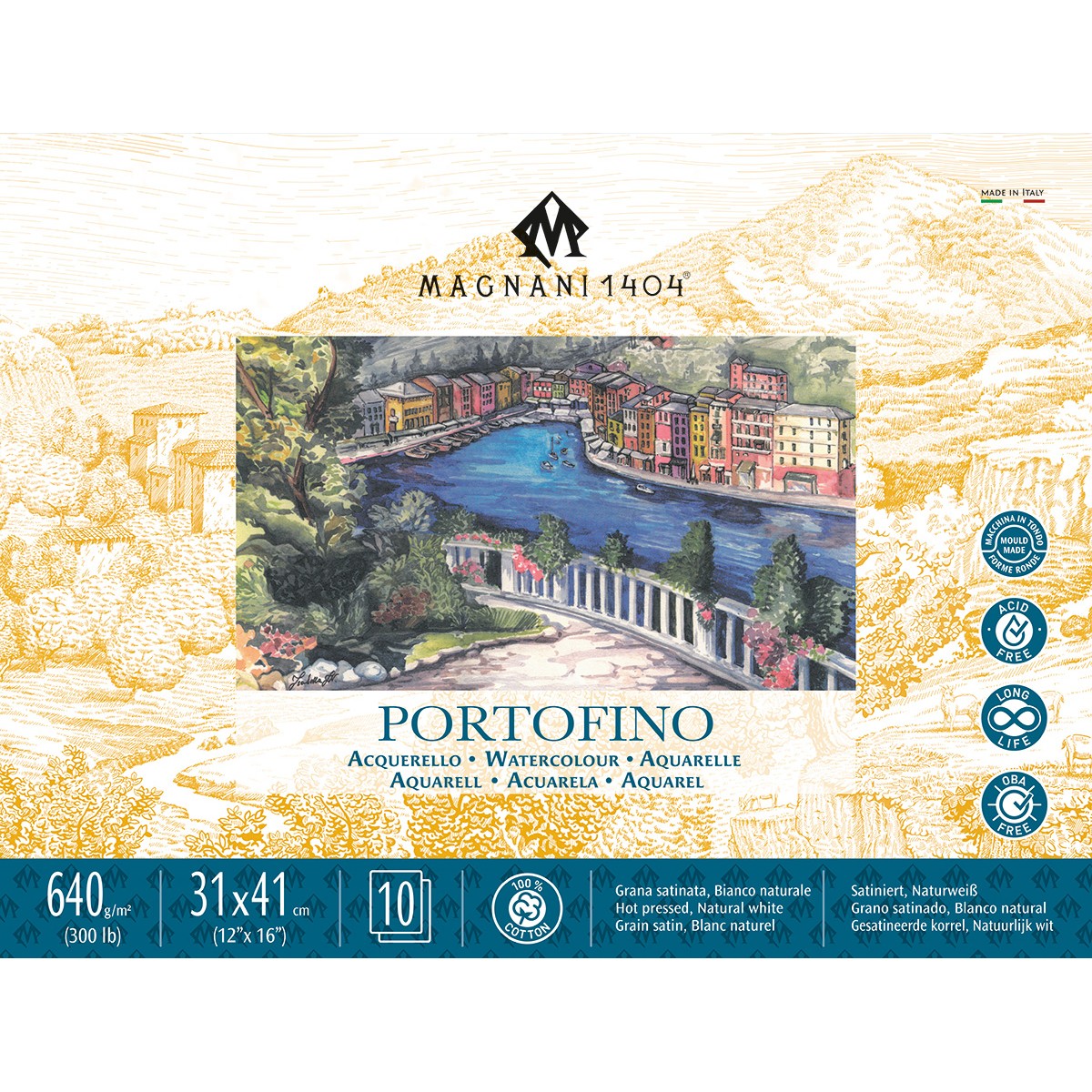 'PORTOFINO' WATERCOLOR PAPER - 100% COTTON - 300 gsm and 640 gsm - Hot Press - Magnani 1404 - a smooth, almost satin-like, premium watercolor paper produced using traditional methods on cylindrical drum machines. This is one of the watercolor papers with the longest history of production, enjoying an impeccable reputation among watercolorists. It is a 100% cotton, acid-free paper, made from the purest cotton fibers. It is double-sized internally and externally using a synthetic gelatin substitute, without the use of animal-derived substances. Its acid-free nature guarantees resistance to aging. Thanks to its strong sizing and the use of cotton in its natural form, it withstands corrections and the removal of paint from its surface exceptionally well, while also being able to absorb large amounts of water without warping. Recommended for painting with watercolors, tempera, gouache, ink, or acrylics. Recommended for printmaking techniques such as lithography or linocut, as it can be soaked, and its smooth surface ensures high-quality prints.
