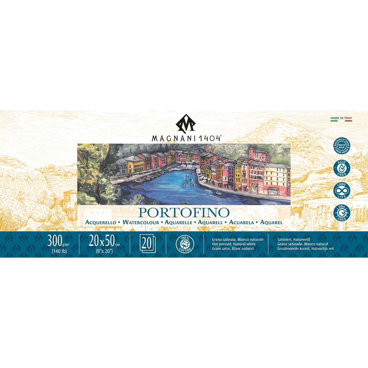 'PORTOFINO' WATERCOLOR PAPER - 100% COTTON - 300 gsm and 640 gsm - Hot Press - Magnani 1404 - a smooth, almost satin-like, premium watercolor paper produced using traditional methods on cylindrical drum machines. This is one of the watercolor papers with the longest history of production, enjoying an impeccable reputation among watercolorists. It is a 100% cotton, acid-free paper, made from the purest cotton fibers. It is double-sized internally and externally using a synthetic gelatin substitute, without the use of animal-derived substances. Its acid-free nature guarantees resistance to aging. Thanks to its strong sizing and the use of cotton in its natural form, it withstands corrections and the removal of paint from its surface exceptionally well, while also being able to absorb large amounts of water without warping. Recommended for painting with watercolors, tempera, gouache, ink, or acrylics. Recommended for printmaking techniques such as lithography or linocut, as it can be soaked, and its smooth surface ensures high-quality prints.