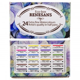 Set of 24 watercolor paints in a cardboard box. The set includes the following colors: