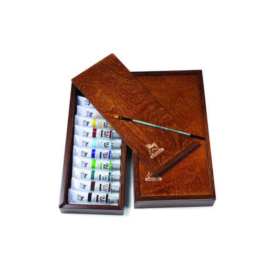 "Olej For Art" oil paint set, wooden case, 10 colors, 20 ml tubes, small brush.