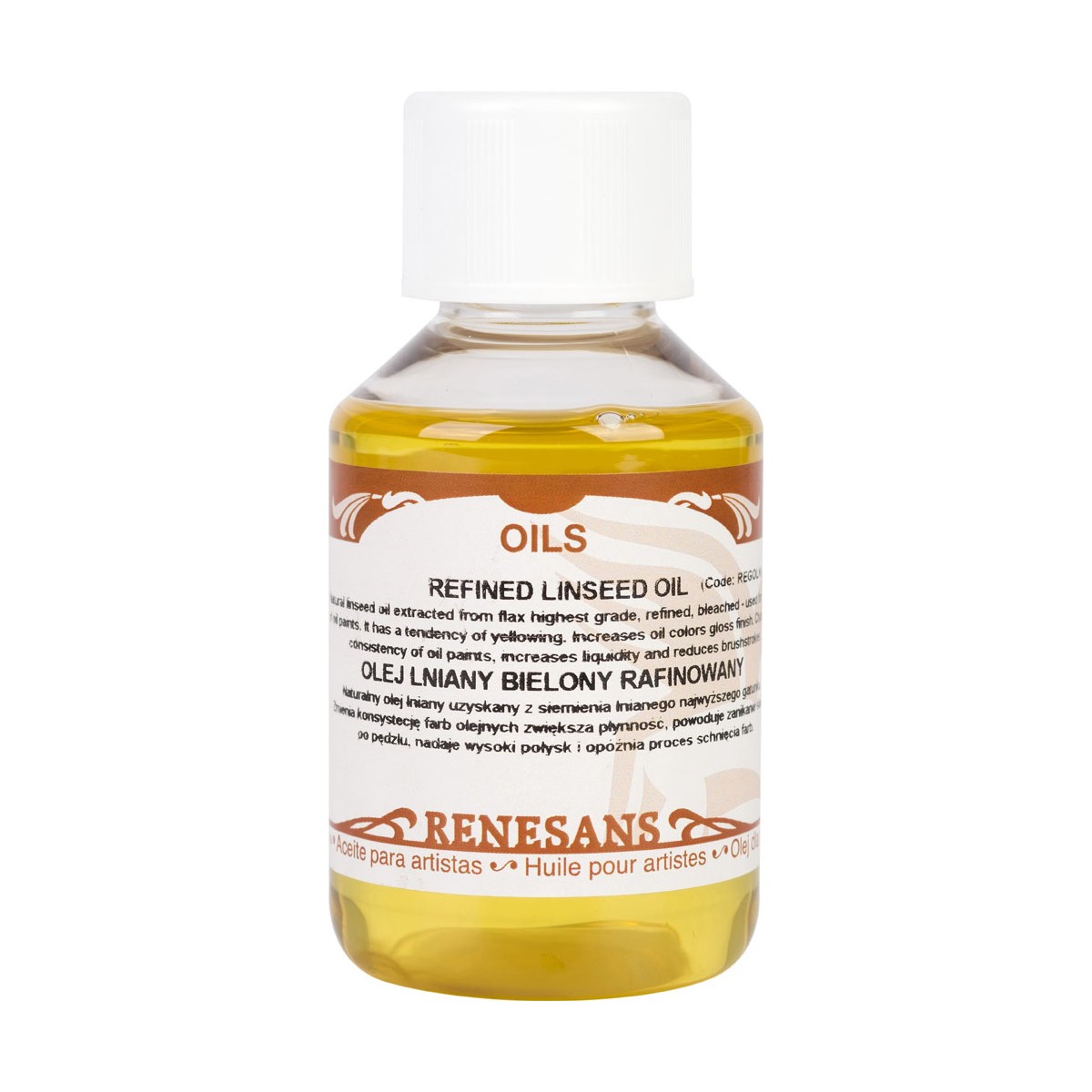 Naturalny olej lniany uzyskany z siemienia lnianego najwyższego gatunku. Zmienia konsystencję farb olejnych zwiększa płynność, powoduje zanikanie śladów po pędzlu, nadaje wysoki połysk i opóźnia proces schnięcia farb.