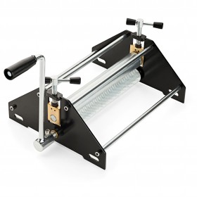 A manual printing press for intaglio and relief printing. The frame is made entirely of steel, while the bearings are made of bronze.