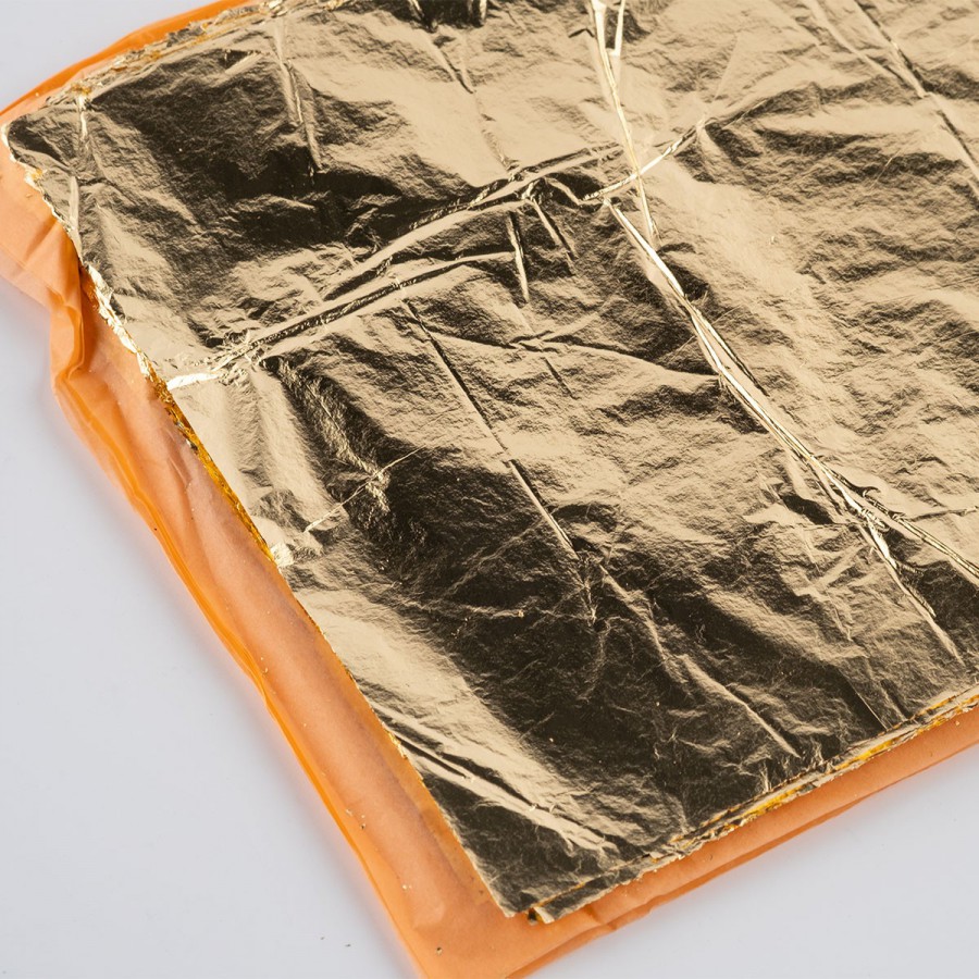 Before applying the gold, prepare an adhesive mixture—a solution of rubbing alcohol, water, and bone glue in the following proportions: 200 ml of water, 50 ml of rubbing alcohol, and a small amount of bone glue (simply dip the brush into the adhesive solution). The resulting solution must be applied very quickly and only to the areas where the gold leaf will be immediately applied. To apply the gold leaf, the book must be positioned as close as possible to the gilding pad so that the leaf can be placed on it with a decisive flick of the wrist. All work on the leaf should be done using a gilding knife, not your hands, and care must be taken to avoid creases. After placing the leaf on the pad, trim it to the size of the object, e.g., a frame, using a gilding knife with a sawing motion back and forth. Next, rub the gilding brush to charge it electrostatically and carefully place it on the trimmed leaf, peel the leaf off the pad, and place it on the surface to be gilded. Ensure that one leaf overlaps the next by a few millimeters. The range consists of several shades and metals: 22-karat gold, 22 3/4-karat gold, silver, schlagmetall in colors 2.5 and 1, aluminum, and copper. This wide range will satisfy both professionals and amateurs.