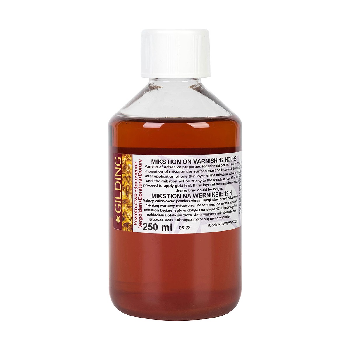 Mikstion na werniksie to mieszanina oleju i werniksu, o właściwościach klejących, do przyklejania płatków metali. Powierzchnia powinna być gładka i zaizolowana np. rozcieńczoną farba akrylową. Po nałożeniu 1 do 2 cienkich warstw mikstionu, po ok. 12 godzinach należy przystąpić do przyklejania płatków, gdy powierzchnia będzie jeszcze lepka w dotyku. Dostępny w butelce o pojemności 250 ml.