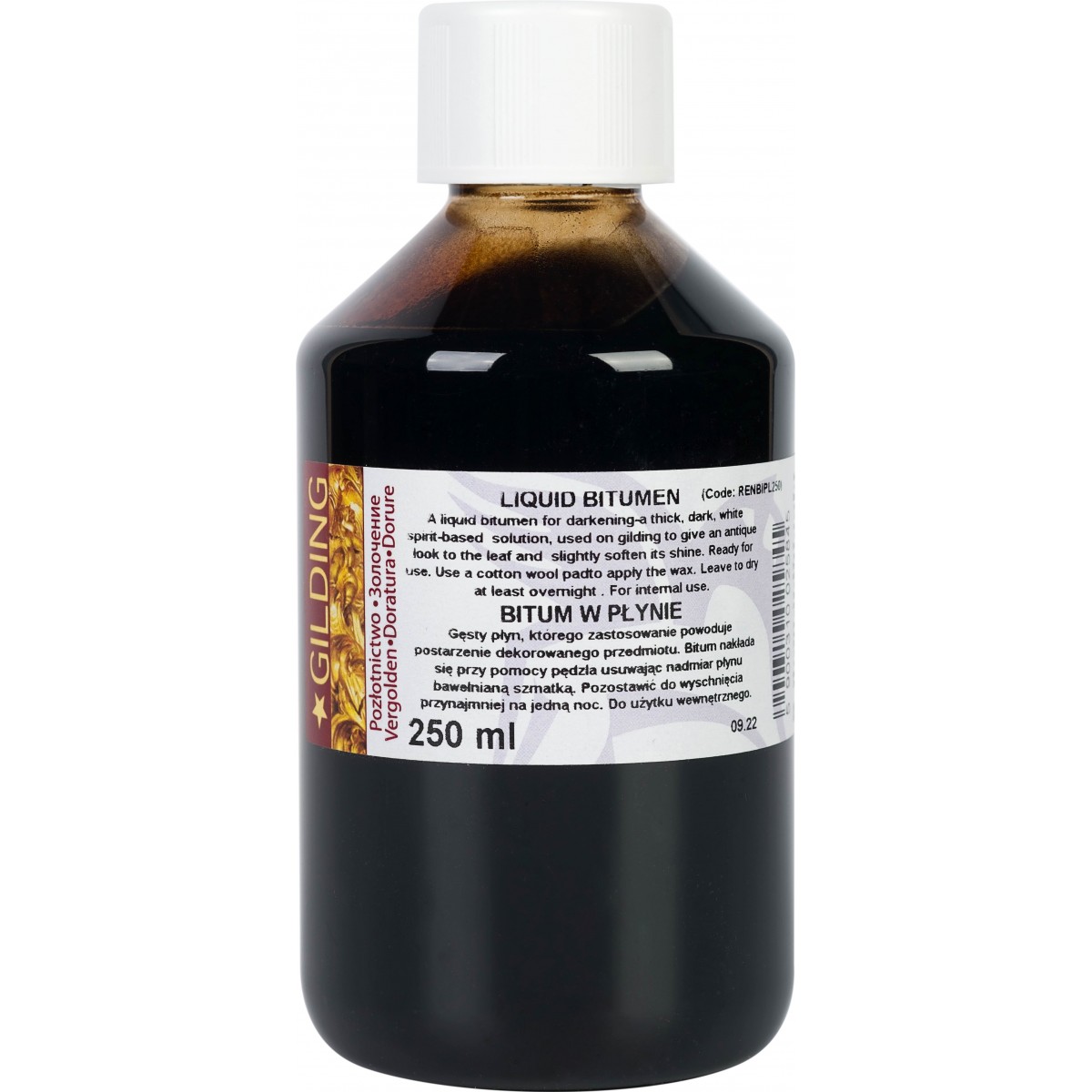 Bitum w płynie to gęsty brunatny płyn do postarzania dekorowanego przedmiotu. Najlepiej nakładać przy pomocy pędzla, usuwając nadmiar płynu bawełnianą szmatką. Pozostawić do wyschnięcia przynajmniej na 24 godziny. Dostępny w butelce o pojemności 250 ml.