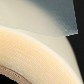 Single-sided adhesive film on a textured polyethylene backing. Once applied to the glass, it helps protect the artwork in case of breakage during transport, for example. The acrylic adhesive has high moisture resistance and leaves no residue when peeled off, even after a long period of time. Thanks to its textured surface, it does not generate static electricity when unrolled from the roll.