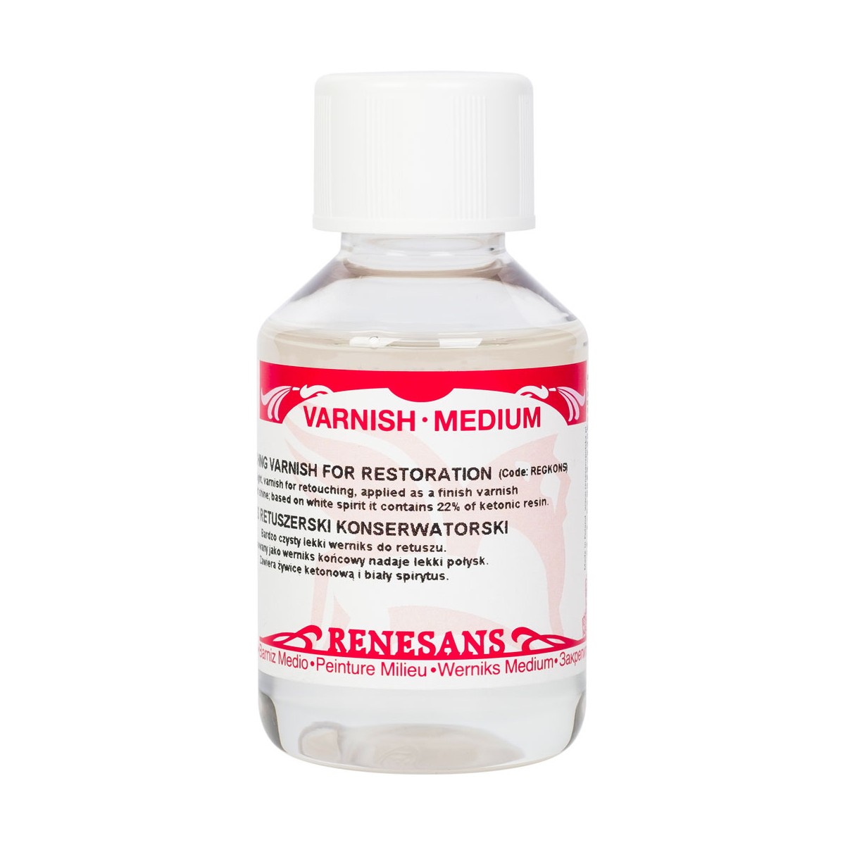 Werniks retuszerski konserwatorski - bardzo czysty lekki werniks do retuszu. Stosowany jako werniks końcowy nadaje lekki połysk. Zawiera żywicę ketonową i biały spirytus.