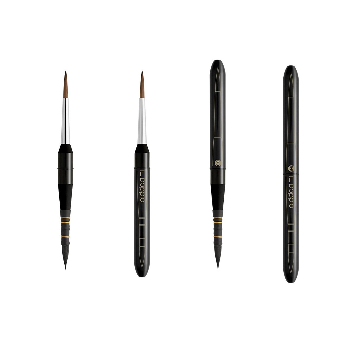 IL DOPPIO - a TRAVEL BRUSH-style double-ended brush with two tips: on one side, round Kolinsky Synthetic bristles—for details, precise motifs, and intricate finishes; on the other side, VAIO BOMBASINO’s signature HIDRO® synthetic bristles, which allow you to pick up plenty of water while working on fine details. The black-lacquered brass handle is lightweight and ergonomically shaped, and the tips are protected by two caps on both ends. An extremely handy and elegant brush, ideal for watercolor and gouache, perfect not only for outdoor use but also as a gift.