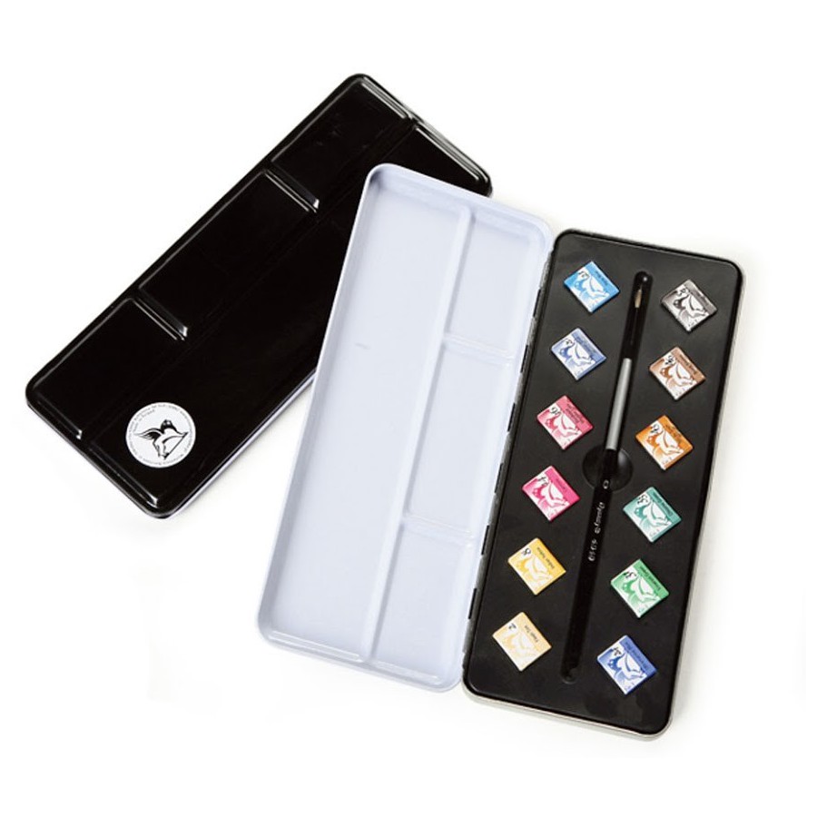 Professional watercolor blocks. Handmade, based on gum arabic and honey. Set of 12 colors in a metal case with a plexiglass insert. Half-godet: 0.5 ml per piece.
