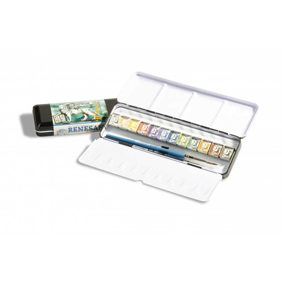 Professional watercolors, handcrafted using gum arabic and honey. A set of 12 half-pan watercolors in a professional metal case. The set also includes 2 high-quality synthetic-bristle brushes.