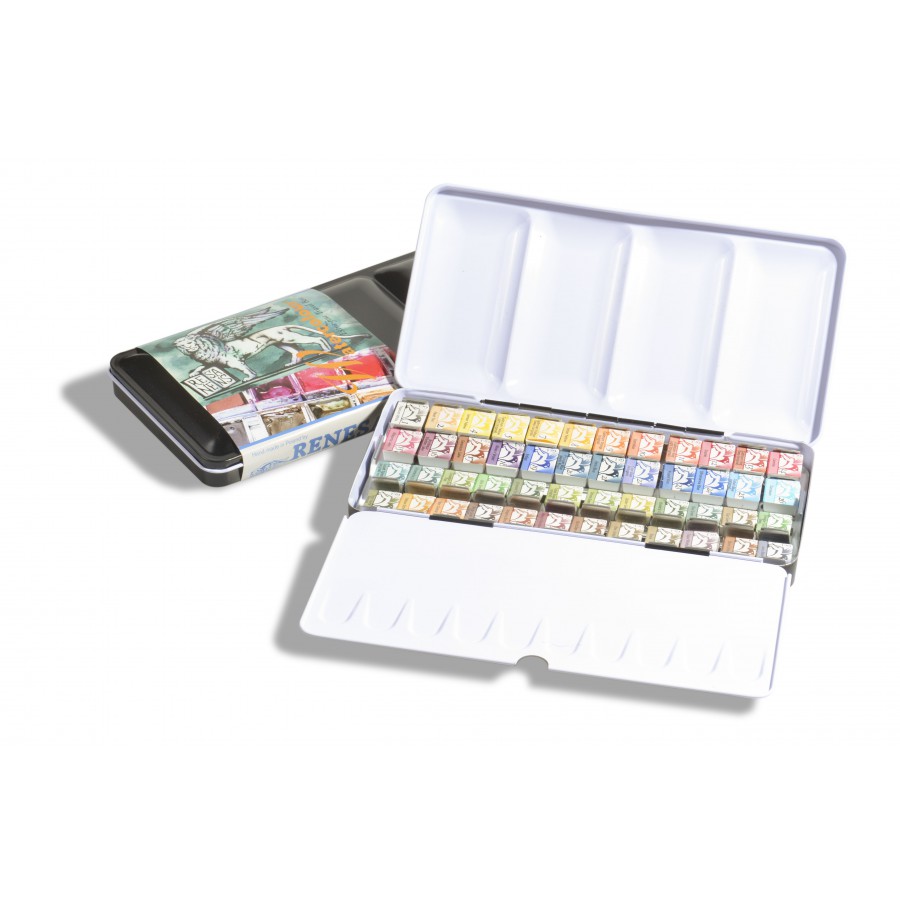 Professional watercolors, handcrafted using gum arabic and honey. A set of 48 half-pan watercolors in a professional metal case.