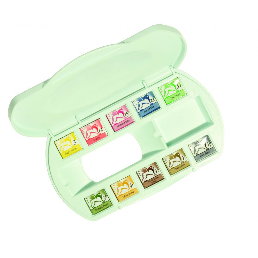 Professional watercolors, handcrafted using gum arabic and honey. Set of 10 half-pan colors in a plastic box.