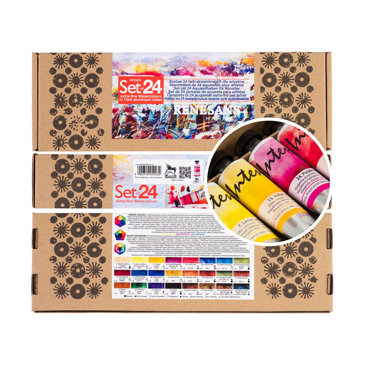 Intense Water Eco Set 24 Colors - 15 ml watercolor paints - printed cardboard box, set of 24 tubes: 5, 7, 15, 18, 21, 24, 27, 28, 29, 30, 31, 42, 44, 47, 51, 52, 53, 54, 56, 59, 61, 63, 65, 70