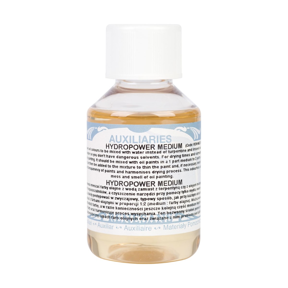 It allows you to mix oil paints with water instead of turpentine or linseed oil. There is no need to use harmful solvents, and cleaning your tools with just soap and water becomes easy. As for drying and varnishing, proceed in the usual way, just as you would with any oil painting. Mix the medium with oil paints using a palette knife in a 1:2 ratio (medium : oil paints). You can then add water to the mixture to further thin the paint, and if necessary, add another portion of Hydropower medium. The medium increases the gloss and transparency of the paints and harmonizes the drying process. This odorless auxiliary agent (with low solvent content) helps reduce the characteristic odor of oil paints and the associated cleanup issues.
