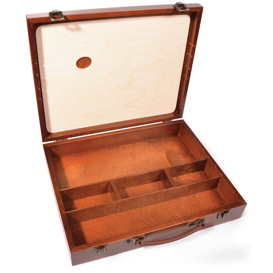 Wooden paint box, 37 x 27.5 x 7 cm, with a rectangular palette.