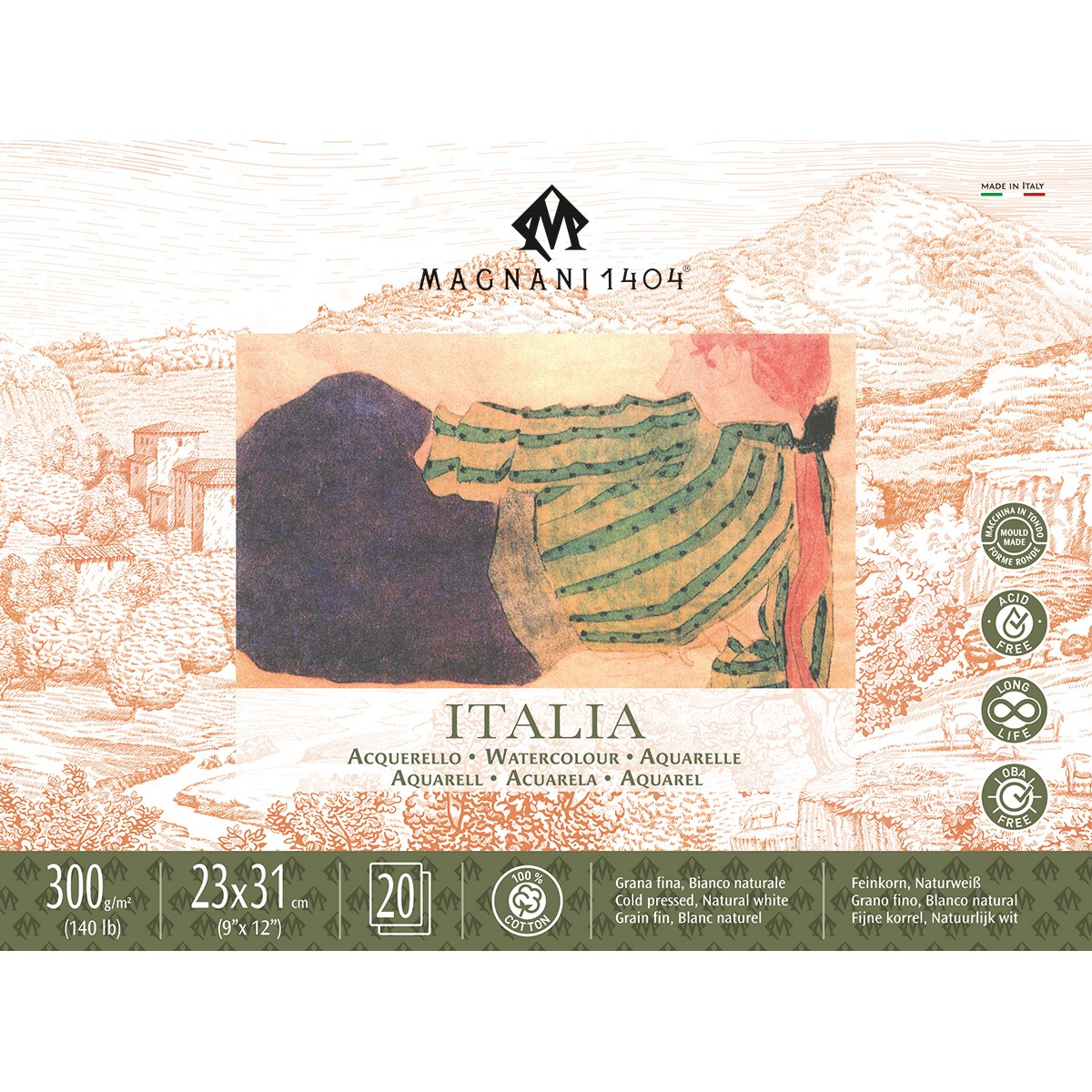 PAPIER AKWARELOWY 'ITALIA' - BAWEŁNA 100% -300 gram i 640 gram - Cold Press - Magnani 1404 - to prestiżowy papier do akwareli wytwarzany tradycyjnymi metodami na cylindrycznych maszynach bębnowych. To jeden z papierów akwarelowych z najdłuższą historią wytwarzania, cieszący się nieskazitelną reputacją wśród akwarelistów. Jest to papier 100 % bawełniany, bezkwasowy, wytwarzany z najczystszych kwiatów bawełny. Jest dwustronnie spojony wewnętrznie i zewnętrznie, przy użyciu syntetycznego odpowiednika żelatyny, bez użycia środków odzwierzęcych. Jego bezkwasowość gwarantuje odporność na proces starzenia. Dzięki mocnemu spojeniu i użyciu bawełny w pierwotnej postaci wyjątkowo dobrze znosi wszelkie korekty oraz usuwanie farby z jego powierzchni, a jednocześnie potrafi wchłonąć duże ilości wody i nie ulegać przy tym deformacjom. Polecany do malowania akwarelami, temperami, gwaszem, tuszem czy akrylem.