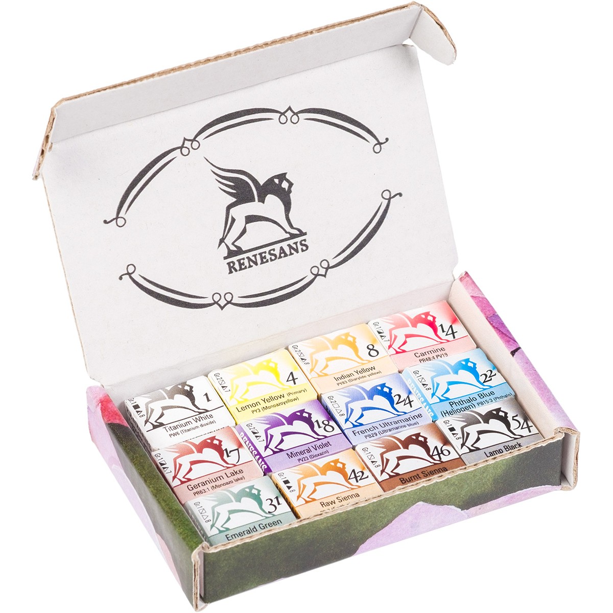 Komplet 12 szt. farb akwarelowych w kartoniku. W skład kompletu wchodzą kolory: