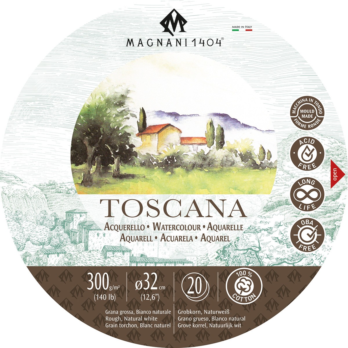 PAPIER AKWARELOWY 'TOSCANA' - BAWEŁNA 100% -300 i 640 gram - Rough - Large grain - Grana grossa - Ziarnisty - Magnani 1404 - to prestiżowy papier do akwareli wytwarzany tradycyjnymi metodami na cylindrycznych maszynach bębnowych. To jeden z papierów akwarelowych z najdłuższą historią wytwarzania, cieszący się nieskazitelną reputacją wśród akwarelistów. Jest to papier 100 % bawełniany, bezkwasowy, wytwarzany z najczystszych kwiatów bawełny. Jest dwustronnie spojony wewnętrznie i zewnętrznie, przy użyciu syntetycznego odpowiednika żelatyny, bez użycia środków odzwierzęcych. Jego bezkwasowość gwarantuje odporność na proces starzenia. Dzięki mocnemu spojeniu i użyciu bawełny w pierwotnej postaci wyjątkowo dobrze znosi wszelkie korekty oraz usuwanie farby z jego powierzchni, a jednocześnie potrafi wchłonąć duże ilości wody i nie ulegać przy tym deformacjom. Polecany do malowania akwarelami, temperami, gwaszem, tuszem czy akrylem.