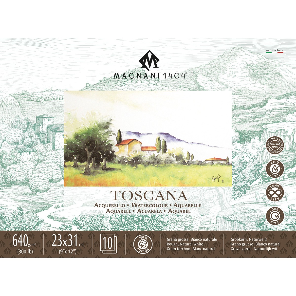 PAPIER AKWARELOWY 'TOSCANA' - BAWEŁNA 100% -300 i 640 gram - Rough - Large grain - Grana grossa - Ziarnisty - Magnani 1404 - to prestiżowy papier do akwareli wytwarzany tradycyjnymi metodami na cylindrycznych maszynach bębnowych. To jeden z papierów akwarelowych z najdłuższą historią wytwarzania, cieszący się nieskazitelną reputacją wśród akwarelistów. Jest to papier 100 % bawełniany, bezkwasowy, wytwarzany z najczystszych kwiatów bawełny. Jest dwustronnie spojony wewnętrznie i zewnętrznie, przy użyciu syntetycznego odpowiednika żelatyny, bez użycia środków odzwierzęcych. Jego bezkwasowość gwarantuje odporność na proces starzenia. Dzięki mocnemu spojeniu i użyciu bawełny w pierwotnej postaci wyjątkowo dobrze znosi wszelkie korekty oraz usuwanie farby z jego powierzchni, a jednocześnie potrafi wchłonąć duże ilości wody i nie ulegać przy tym deformacjom. Polecany do malowania akwarelami, temperami, gwaszem, tuszem czy akrylem.